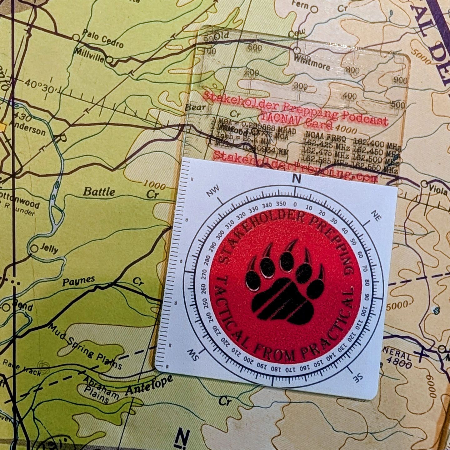 The TACNAV Card is sold in a kit with a Fresnel magnifying lens for map-reading & fire-starting, a bamboo/cotton tinder card for easy fire-starting, and a pretty awesome sticker